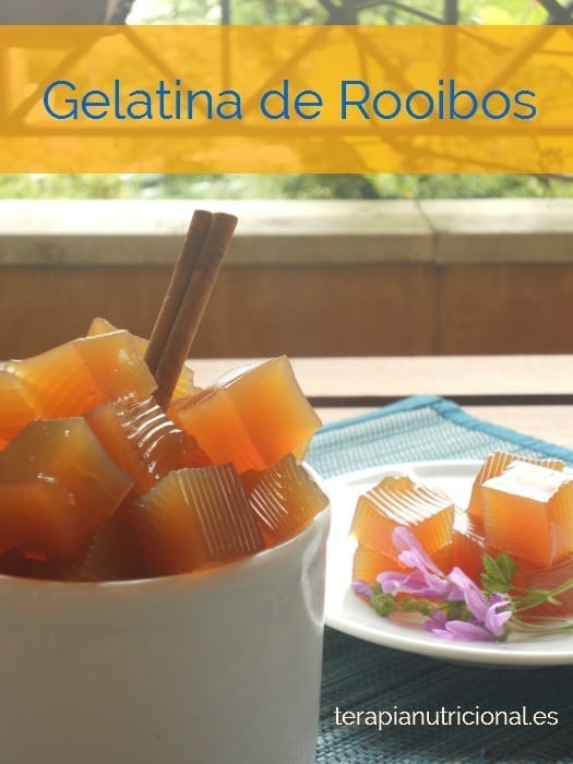 Esta gelatina, de delicado y exótico sabor, nos aporta a la vez los beneficios de la gelatina y del té de Rooibos. En realidad el té de Rooibos no tiene nada que ver con la planta del té (Camellia Sinensis), sino que es una infusión que proviene de un arbusto de origen sudafricano. Existe en dos variedades, rooibos verde y rooibos rojo o simplemente rooibos, la más común y fácil de encontrar. La diferencia está en que en el rooibos rojo las hojas se han dejado oxidar al sol, produciendo su sabor característico y su coloración roja. No hay que confundir esta infusión con el llamado "té rojo" o "té pu-erh", que sí pertenece a la familia del té. Además de su delicioso sabor, nada amargo, esta infusión aporta sorprendentes beneficios: